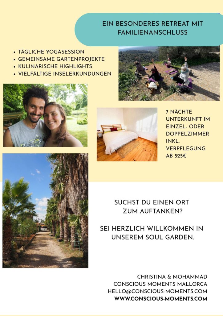 Neben Yoga, Stille-Momente, gemeinsames Kochen und Ausflüge (Strand, Wochenmarkt, Berge) wollen wir täglich “Karma-Yoga” praktizieren und uns im Garten und beim kreativen Entstehen auf der Finca betätigen (ca. 3 Std. pro Tag). Durch das Tun in Verbindung mit der gelebten Achtsamkeit (Yoga, Meditation & Stille) dürfen persönliche innere Prozesse in Bewegung kommen.